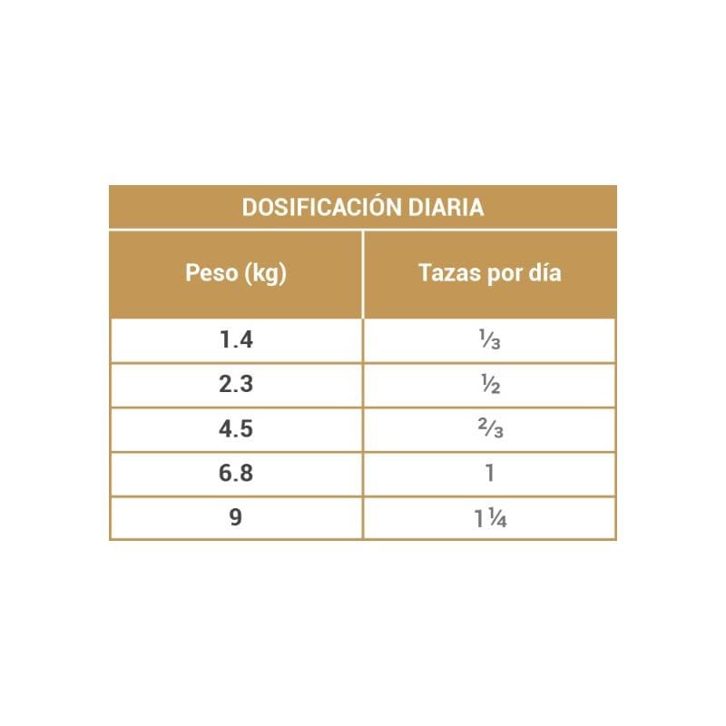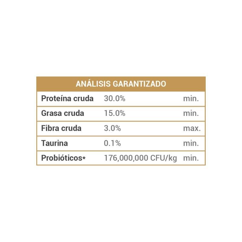 Ingredientes: harina de subproducto de pollo, granos enteros de maíz molidos, harina de trigo, grasa de pollo (preservada con mezcla de tocoferoles), harina de gluten de maíz, arroz blanco molido, pulpa de remolacha deshidratada, saborizante natural (pollo), linaza, harina de pescado, bisulfato de sodio, cloruro de potasio, cloruro de colina, DL-metionina, taurina, producto de fermentación de lactobacillus plantarum secos, producto de fermentación de bacillus subtilis secos, producto de fermentación de lactobacillus acidophilus secos, producto de fermentación de enterococcus faecium secos, producto de fermentación de bifidobacterium animalis secos, proteinato de zinc, suplemento de vitamina E, niacina, proteinato de manganeso, proteinato de cobre, sulfato de zinc, sulfato de manganeso, sulfato de cobre, mononitrato de tiamina, suplemento de vitamina A, biotina, yoduro de potasio, pantotenato de calcio, riboflavina, clorhidrato de piridoxina (vitamina B6), suplemento de vitamina B12, óxido de manganeso, selenito de sodio, suplemento de vitamina D, ácido fólico.
