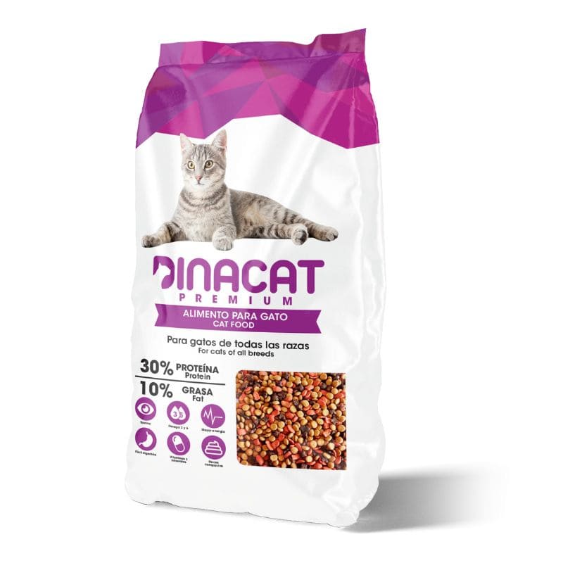 Dinacat es un alimento Premium formulado por especialistas, proporciona un balance óptimo de nutrientes que cubre los requerimientos de los gatos en todas las etapas.
