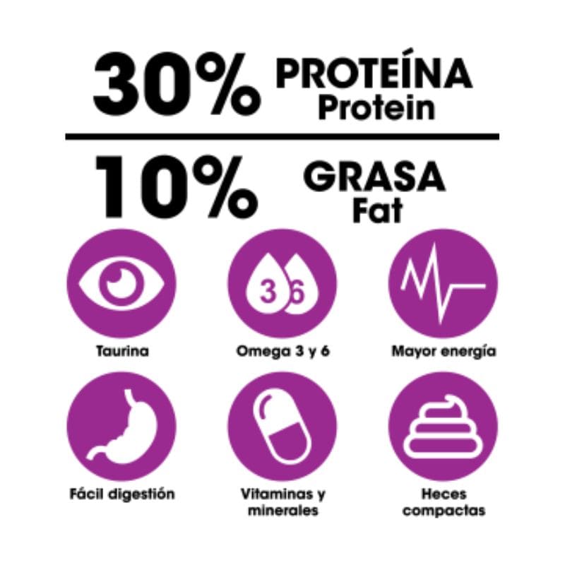 INGREDIENTES: Carne y hueso bovino y/o pollo y/o cerdo y/o pescado en harinas, cereales, arroz, grasa animal (bovino y/o pollo y/o cerdo), pastas oleaginosas, colina, taurina, lisina, metionina, Omegas 3 y 6, extracto de Yuca,
