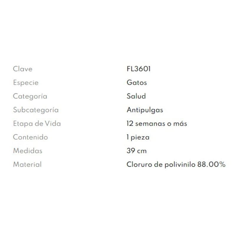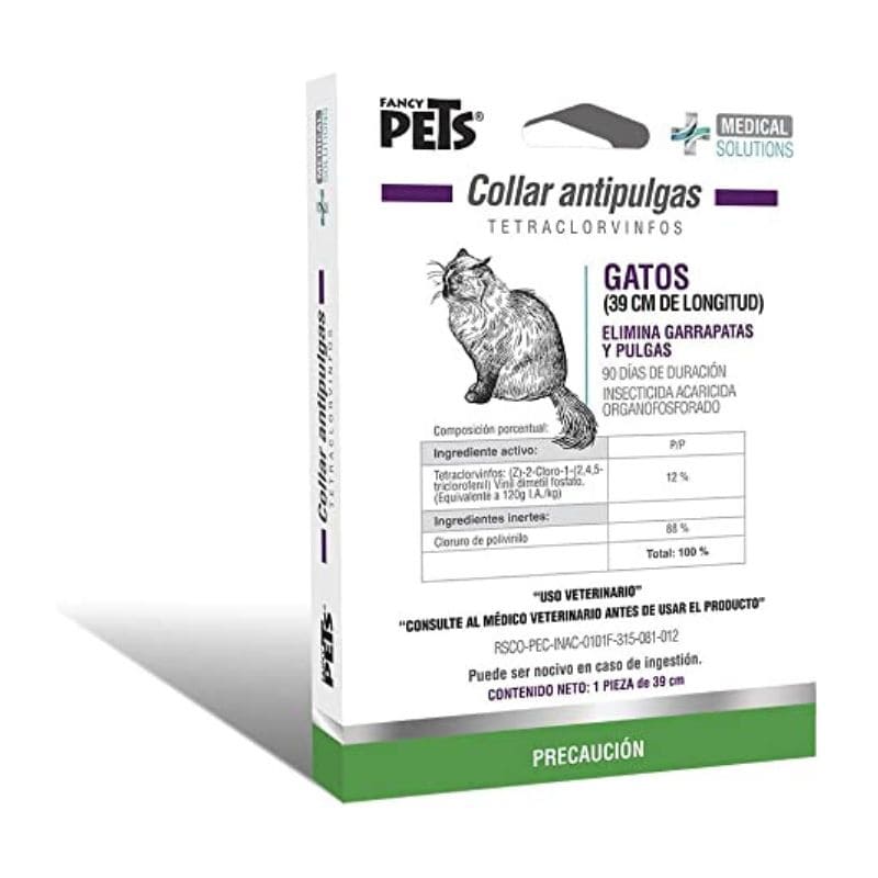 El collar antipulgas para gatos (a partir de 12 semanas de edad) de Medical Solutions® es un acaricida eficaz contra pulgas y garrapatas. Su mecanismo de acción actúa como paralizador del parásito, provocando su muerte y previniendo la reinfestación. Es resistente al agua y repele a los ectoparásitos hasta por 90 días.