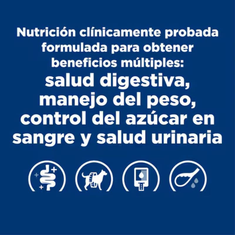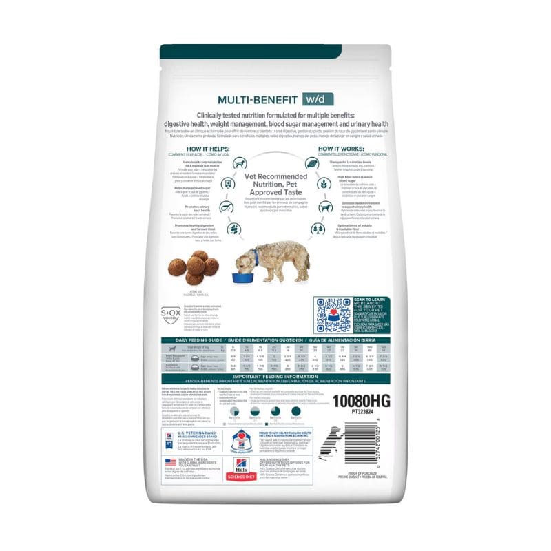 Hill's Prescription Diet w/d Multi-Benefit está formulado exclusivamente para beneficiar a su mascota en múltiples niveles: salud urinaria, salud digestiva, control del azúcar en la sangre y control del peso. Esta mezcla de nutrientes balanceados y fibras solubles e insolubles funciona en múltiples frentes para ayudar a las mascotas a vivir una vida feliz y saludable.