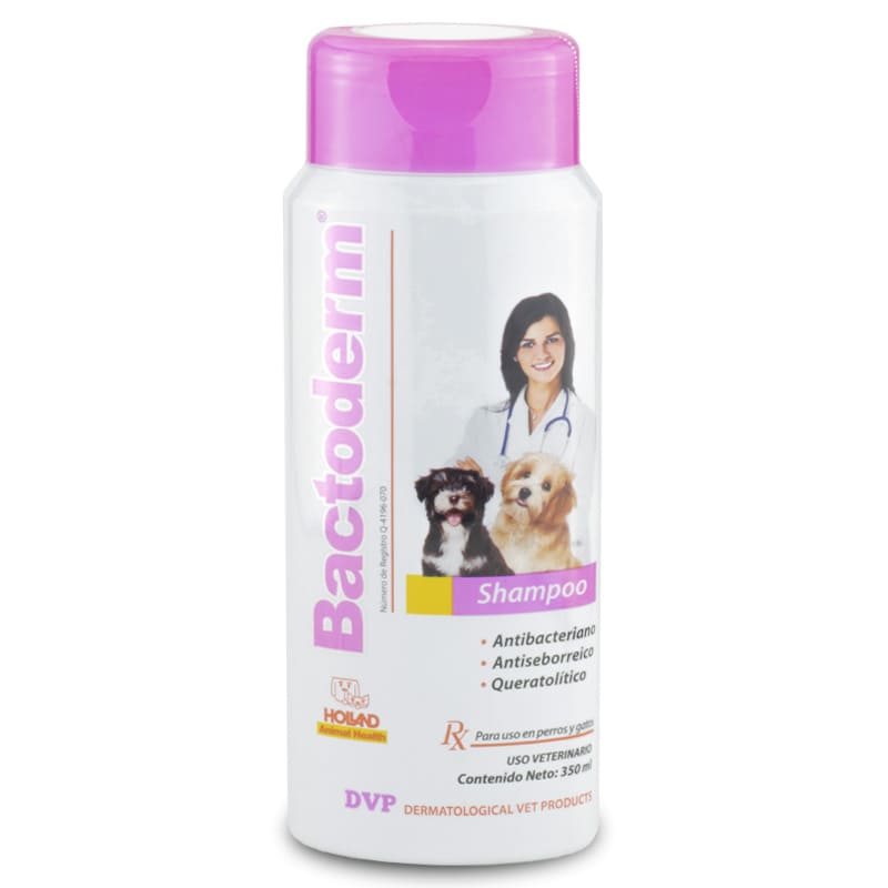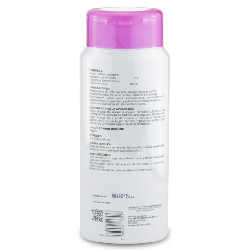 Características: Antibacteriano, antiseborreico y queratolítico para perros y gatos. Bote: 350 ml. Fórmula: peróxido de benzoilo 3g, complejo humectante y vehículo cbp 100 ml. Instrucciones de aplicación: Moje el pelo del animal y aplique cantidad suficiente de shampoo frotando hasta obtener una espuma abundante, deje actuar de 5 minutos y enjuague. Repita la aplicación 2 a 3 veces por semana y posteriormente cada semana o con la frecuencia que indique el médico veterinario.
