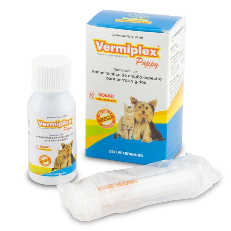 Holland Vermiplex Puppy. Suspensión antiparasitario ideal para tu cachorro perro o gato, de fácil administración por ser en suspensión y porque tiene un delicioso sabor que le encantará. Combate diversos tipos de gusanos intestinales. DOSIS: 1 mL de Vermiplex® Puppy suspensión por cada kg de peso corporal. El tratamiento puede administrarse a partir de las 2 semanas de edad, repitiendo la dosis cada 15 días hasta los 3 meses de edad. En casos de infestación severa se sugiere repetir la dosis durante 3 días consecutivos. Puede administrarse a hembras en período de gestación o lactancia. La dosis puede modificarse a criterio del Médico Veterinario.