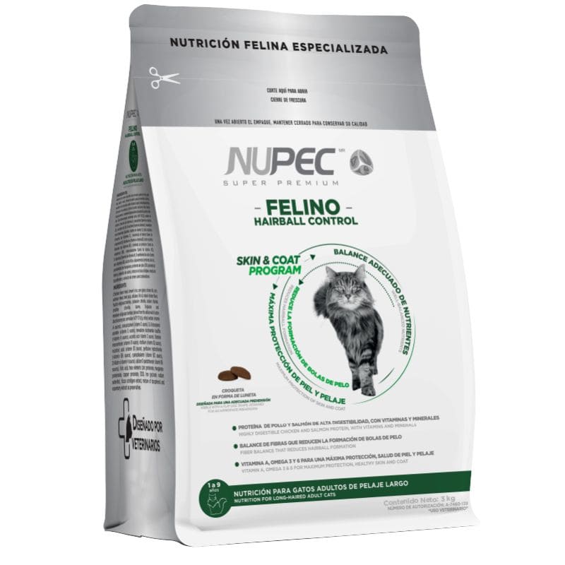 Nupec Felino Hairball. Estamos conscientes de que el metabolismo de un felino de pelaje largo requiere de una nutrición especializada. Por ello hemos formulado un alimento con un balance adecuado de nutrientes que ayuda a reducir la formación de bolas de pelo, brindándole máxima protección de piel y pelaje.