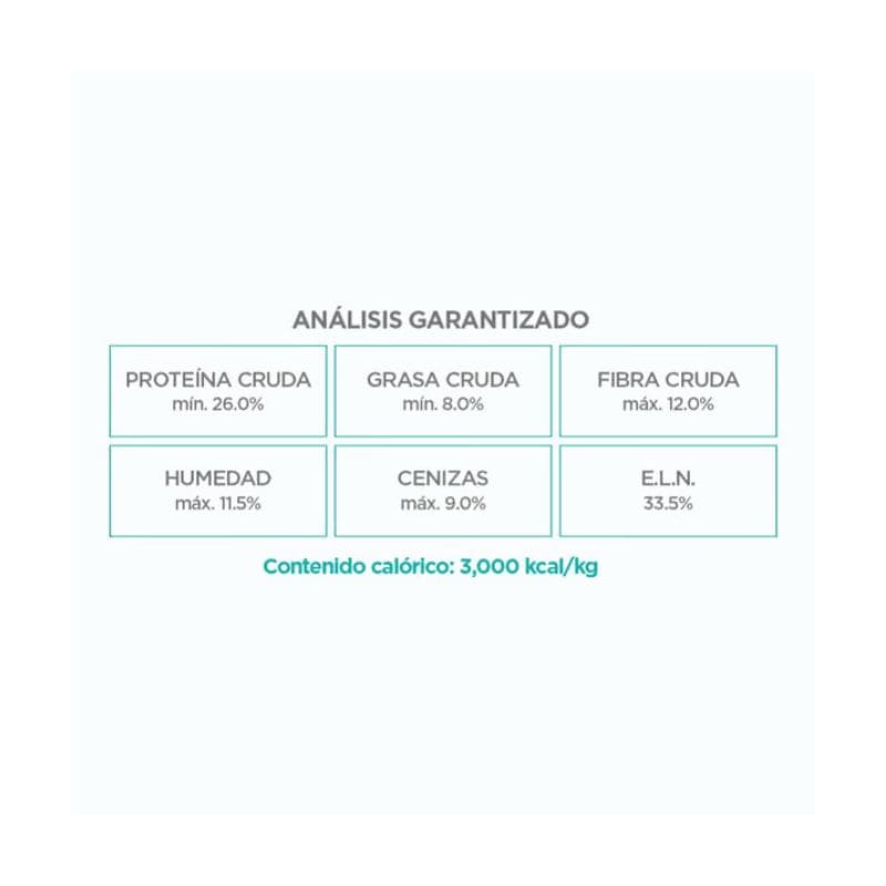 Ingredientes: harina de carne de res, arroz, maíz, carne de pollo, harina de pescado, harina de pollo, pulpa de remolacha, semilla de linaza, grasa de pollo, levadura de cerveza, harina de huevo, fósforo, calcio, sodio, potasio, cloruro de colina, fructooligosacáridos, acetato de retinol (fuente de vitamina A), colecalciferol (fuente de vitamina D), acetato de DL- alpha tocoferol (fuente de vitamina E), menadiona nicotinamida bisulfato (fuente de vitamina K), ácido ascórbico (fuente de vitamina C), mononitrato de tiamina (fuente de vitamina B1), riboflavina (fuente de vitamina B2), ácido nicotínico (fuente de vitamina B3), clorhidrato de piridoxina (fuente de vitamina B6), cianocobalamina (fuente de vitamina B12), D-biotina (fuente de vitamina H), D-pantotenato de calcio (fuente de vitamina B5), ácido fólico, zinc orgánico, hierro orgánico, manganeso orgánico, cobre orgánico, EDDI, selenio orgánico, L-carnitina, extracto de yucca schidigera, mezcla de romero y tocoferoles como conservadores. Análisis garantizado Contenido calórico: 3000 kcal/kg Proteína cruda (Mín): 26.0% Grasa cruda (Mín): 8.0% Fibra cruda (Máx): 12.0% Humedad (Máx): 11.5% Cenizas (Máx): 9.0% E.L.N.: 33.5%