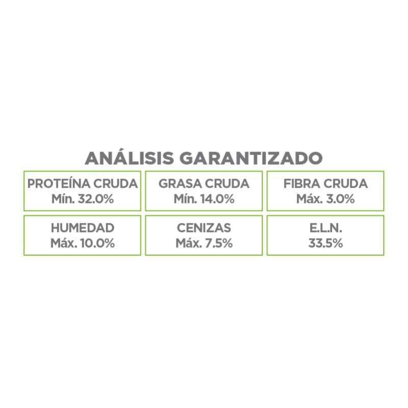 Ingredientes: harina de carne de pollo, arroz cervecero, grasa de pollo, maíz, pulpa de remolacha, harina de pescado, aceite de pescado, sabor natural de pollo, extracto de raíz de achicoria, fructooligosacáridos, mananooligosacáridos, cloruro de sodio, cloruro de potasio, cloruro de colina, levadura hidrolizada (saccharomyces cerevisiae activa 10x1010), taurina, acetato de retinol (fuente de vitamina A), colecalciferol (fuente de vitamina D), acetato de DL-alpha-tocoferol (fuente de vitamina E), menadiona nicotinamida bisulfato (fuente de vitamina K), ácido ascórbico (fuente de vitamina C), mononitrato de tiamina (fuente de vitamina B1), riboflavina (fuente de vitamina B2), ácido nicotínico (fuente de vitamina B3), clorhidrato de piridoxina (fuente de vitamina B6), cianocobalamina (fuente de vitamina B12), D-biotina (fuente de vitamina H), D-pantotenato de calcio (fuente de vitamina B5), ácido fólico, oligoelementos (proteinato de zinc, proteinato de manganeso, proteinato de cobre, EDDI, glicinato de hierro, selenito de sodio), extracto de yucca schidigera, mezcla de tocoferoles y extracto de romero como conservadores. Análisis garantizado Proteína cruda (Mín): 32.0% Grasa cruda (Mín): 14.0% Fibra cruda (Máx): 3.0% Húmedad (Máx): 10.0% Cenizas (Máx): 7.5% E.L.N.: 33.5%