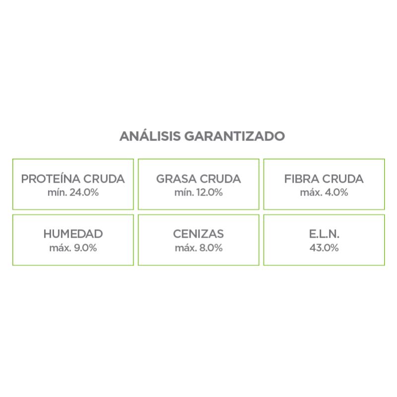 Alimento seco para perro adulto. Bulto: 2 Kg, 5 kg, 8 Kg, 15 kg y 20 Kg. Ingredientes: harina de carne de res, arroz, maíz, carne de pollo, concentrado de proteína vegetal, grasa de pollo, harina de carne de pollo, pulpa de remolacha, semilla de linaza, harina de pescado, sabor natural de pollo, fósforo, calcio, sodio, extracto de raíz de achicoria, cloruro de colina, levadura hidrolizada (Saccharomyces cerevisiae activa 10x1010 ), acetato de retinol (fuente de vitamina A), colecalciferol (fuente de vitamina D), acetato de DL- alpha tocoferol (fuente de vitamina E), menadiona nicotinamida bisulfato (fuente de vitamina K), ácido ascórbico (fuente de vitamina C), mononitrato de tiamina (fuente de vitamina B1), riboflavina (fuente de vitamina B2), ácido nicotínico (fuente de vitamina B3), clorhidrato de piridoxina (fuente de vitamina B6), cianocobalamina (fuente de vitamina B12), D-biotina (fuente de vitamina H), D-pantotenato de calcio (fuente de vitamina B5), ácido fólico, hierro orgánico, manganeso orgánico, selenio orgánico, cobre orgánico, zinc orgánico, EDDI, extracto de yucca schidigera, mezcla de romero y tocoferoles como conservadores. Análisis garantizado: Contenido calórico: 3500 kcal/kg Proteína cruda (Mín): 24.0% Grasa cruda (Mín): 12.0% Fibra cruda (Máx): 4.0% Humedad (Máx): 9.0% Cenizas (Máx): 8.0% E.L.N.: 43.0%