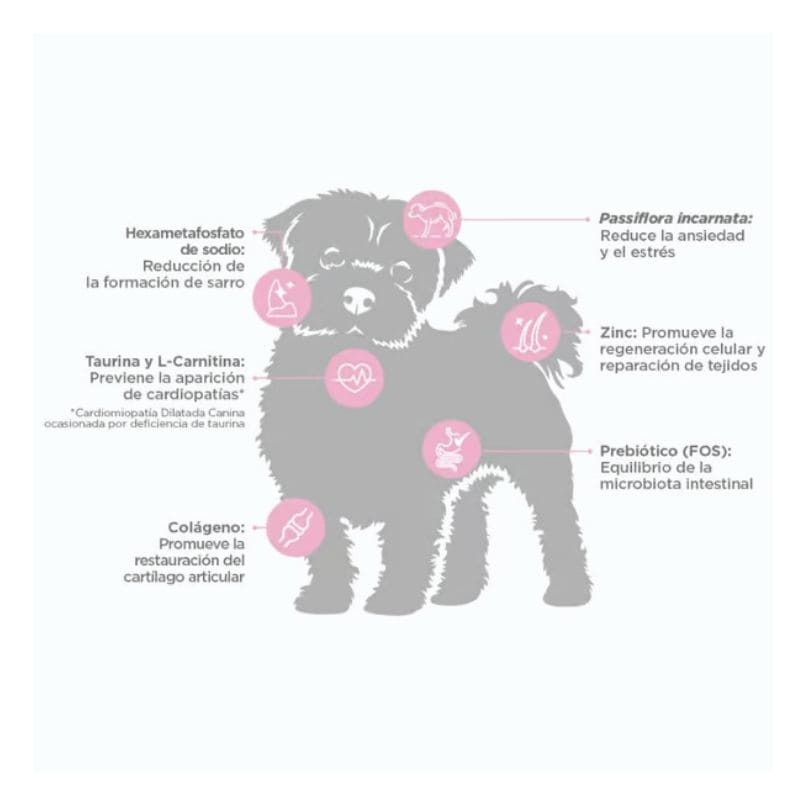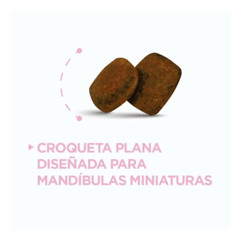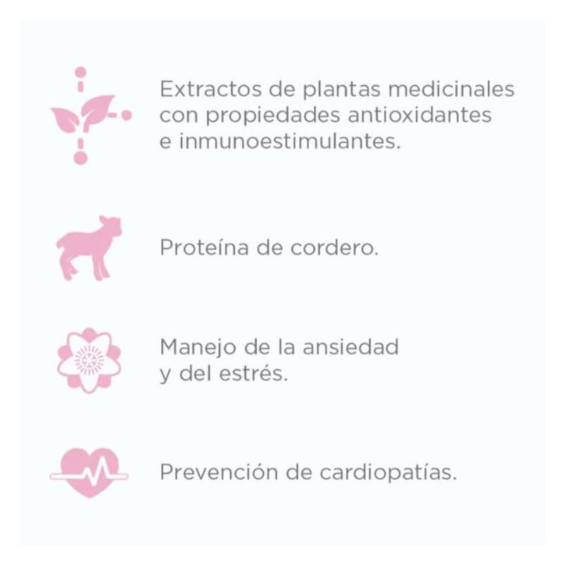Alimento balanceado para perro raza mini adulto con extracto de plantas medicinales con propiedades antioxidantes e inmunoestimulantes, colágeno para el optimo desarrollo articular, vitamina E y selenio para un adecuado desarrollo del sistema inmune, proteína de cordero, manejo de la ansiedad y el estrés, prevención de cardiopatías. Hecho en México
