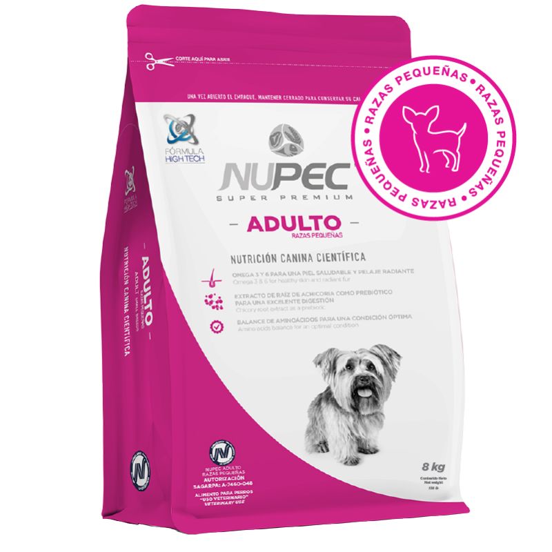 Alimento completo y balanceado formulado para perros adulto de talla miniatura Proteína 25%, Grasa 14%, Fibra 4%, Húmedad 12%.