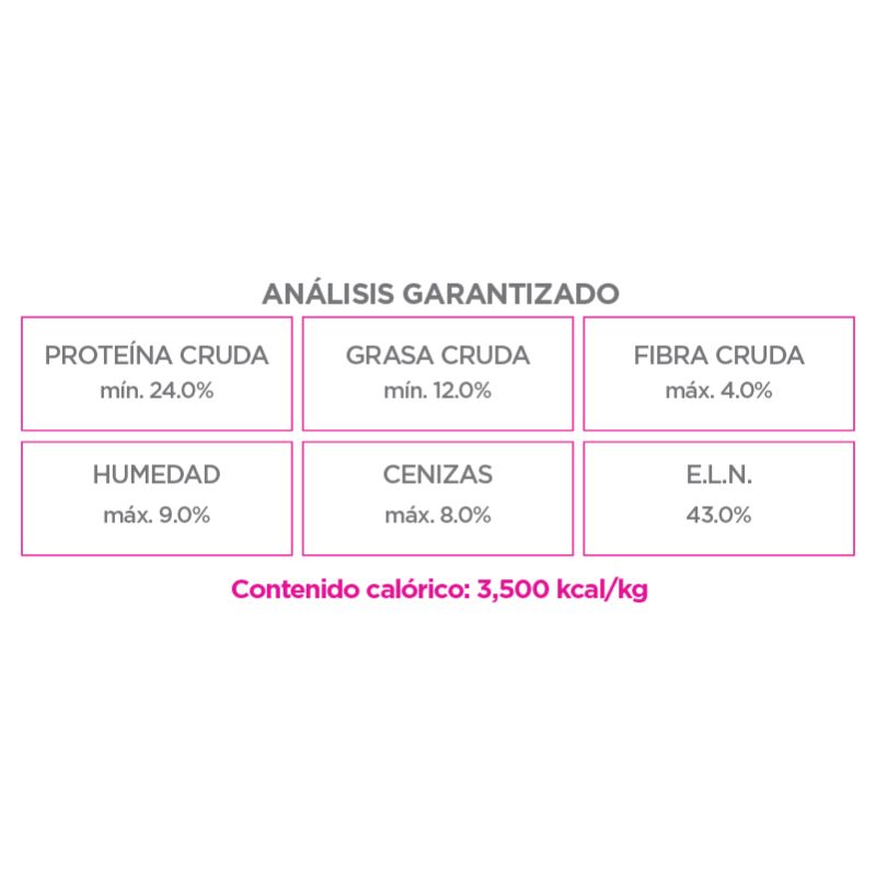 Ingredientes: Arroz, trigo, harina de carne de res, harina de carne de pollo, oleaginosas, grasa de pollo, pulpa de remolacha, sabor natural de pollo, amaranto, camote, chícharo, nopal, cloruro de sodio, cloruro de potasio, calcio, cloruro de colina, acetato de retinol (fuente de vitamina A), colecalciferol (fuente de vitamina D), acetato de DL-a-tocoferol (fuente de vitamina E), menadiona nicotinamida bisulfato (fuente de vitamina K), mononitrato de tiamina (fuente de vitamina B1), riboflavina (fuente de vitamina B2), ácido nicotínico (fuente de vitamina B3), clorhidrato de piridoxina (fuente de vitamina B6), cianocobalamina (fuente de vitamina B12), D-biotina (fuente de vitamina H), D-pantotenato de calcio (fuente de vitamina B5), ácido fólico, zinc orgánico, manganeso orgánico, cobre orgánico, EDDI, hierro orgánico, selenito de sodio, extracto de Yucca schidigera, mezcla de tocoferoles y extracto de romero como conservadores.
