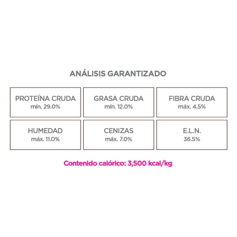 Alimento seco para perro adulto (mayor de 7 años) de raza pequeña. Bulto: de 2 kg, 8 Kg. Ingredientes: harina de carne de res, maíz, arroz, carne de pollo, grasa de pollo, harina de pescado, pulpa de remolacha, concentrado de proteína vegetal, sabor natural de pollo, fósforo, calcio, sodio, acetato de retinol (fuente de vitamina A), colecalciferol (fuente de vitamina D), acetato de DL- alpha tocoferol (fuente de vitamina E), menadiona nicotinamida bisulfato (fuente de vitamina K), ácido ascórbico (fuente de vitamina C), mononitrato de tiamina (fuente de vitamina B1), riboflavina (fuente de vitamina B2), ácido nicotínico (fuente de vitamina B3), clorhidrato de piridoxina (fuente de vitamina B6), cianocobalamina (fuente de vitamina B12), D-biotina (fuente de vitamina H), D-pantotenato de calcio (fuente de vitamina B5), ácido fólico, hierro orgánico, manganeso orgánico, selenio orgánico, cobre orgánico, zinc orgánico, EDDI, glucosamina, sulfato de condroitina, extracto de yucca schidigera, mezcla de romero y tocoferoles como conservadores. Análisis garantizado Contenido calórico: 3500 kcal/kg Proteína cruda (Mín): 29.0% Grasa cruda (Mín): 12.0% Fibra cruda (Máx): 4.5% Humedad (Máx): 11.0% Cenizas (Máx): 7.0% E.L.N.: 36.5%