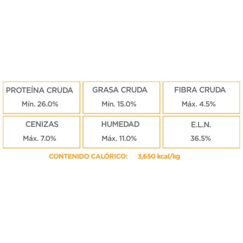 Arroz, harina de carne de pollo, maíz, grasa de pollo, concentrado de proteína de soya, pulpa de remolacha, levadura de cerveza, harina de pescado, sabor natural de pollo, aceite de pescado, harina de huevo, fósforo, sodio, mananooligosacáridos, fructooligosacáridos, celulosa, lisina, metionina, taurina, glutamina, treonina, cloruro de colina, calcio, potasio, suplemento de vitamina A, colecalciferol, acetato de DL-alfa tocoferol, complejo de bisulfito sódico de menadiona, mononitrato de tiamina, riboflavina, ácido nicotínico, clorhidrato de piridoxina, cianocobalamina, D-biotina, pantotenato de calcio, ácido fólico, glicinato de hierro, glicinato de manganeso, hidroxianálogo de seleniometionina, glicinato de cobre, glicinato de zinc, dihidroyoduro de diamino etileno, extracto de Yucca schidigera, romero y tocoferoles como conservadores.