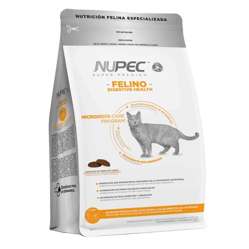 NUPEC FELINO DIGESTIVE HEALTH es un alimento especializado auxiliar en el manejo integral de la salud digestiva de los felinos. La adición de prebióticos favorece la salud intestinal, ya que promueve el desarrollo de bacterias benéficas. Agregamos GLUTAMINA, un aminoácido que provee de energía a los enterocitos, favoreciendo así, la regeneración de la pared intestinal. La calidad de los ingredientes, las proteínas altamente digestibles, así como el balance de fibras hacen de NUPEC FELINO DIGESTIVE HEALTH un alimento que promueve la salud intestinal de tu gato.