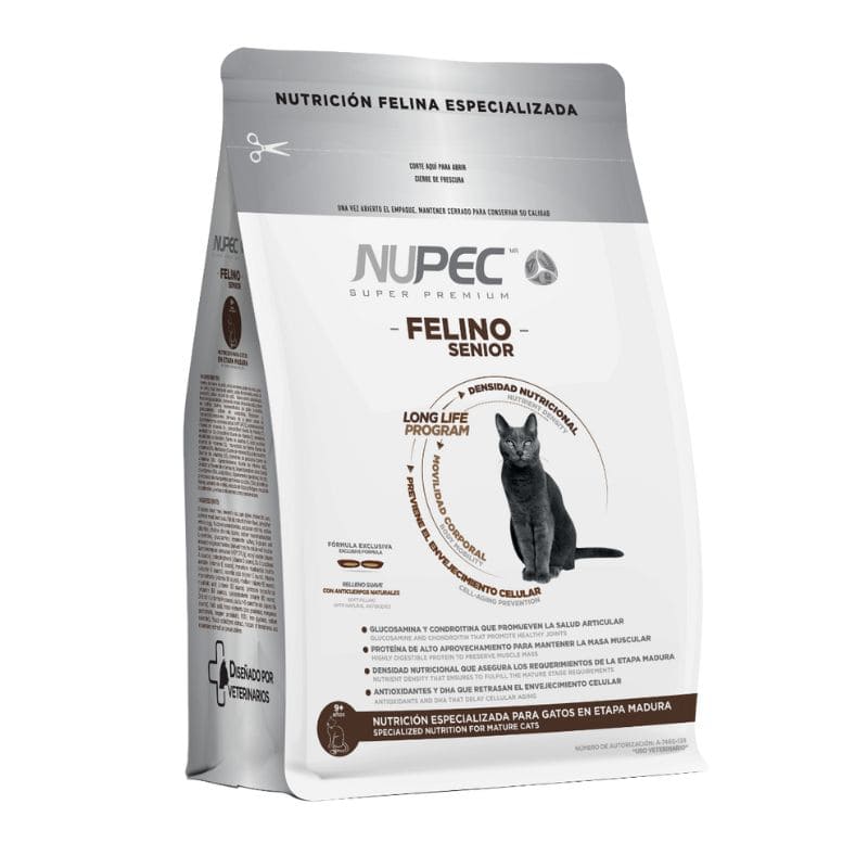 En NUPEC estamos conscientes de que el metabolismo de un felino senior requiere de una nutrición formulada específicamente para cubrir las necesidades propias de un adulto de etapa madura. Por ello hemos formulado una nutrición especializada con un balance de ingredientes que previene el envejecimiento celular, manteniéndolo activo y sano por más tiempo.