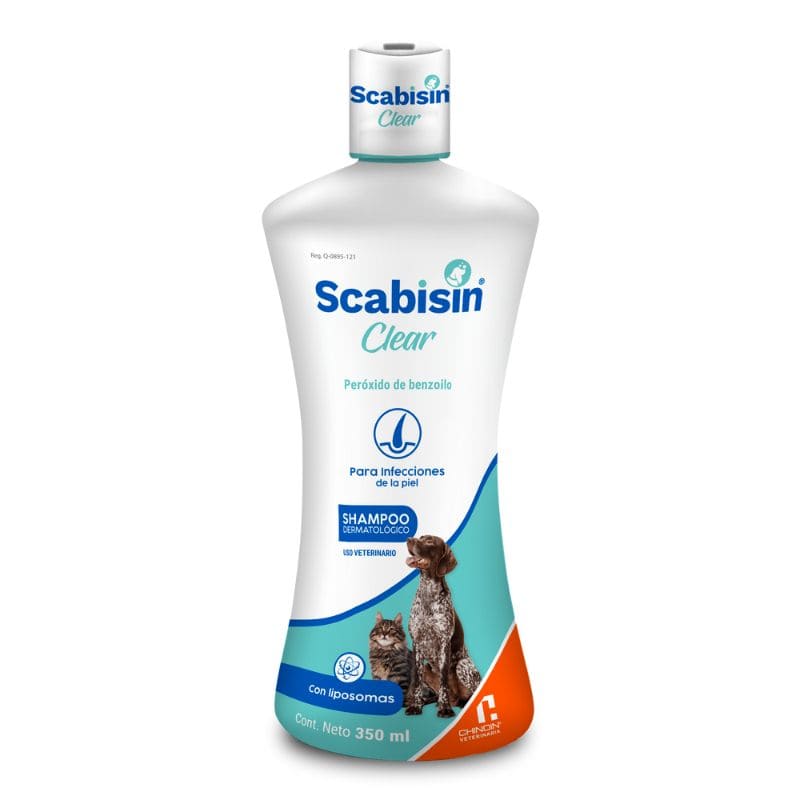 SCABISIN CLEAR® es un shampoo dermatológico que tiene acción bactericida, antiinflamatoria y comedolítica. Está indicado para el tratamiento piodermas superficiales y profundos, en foliculitis, furunculosis, demodicosis, acné, síndrome comedogénico y adenitis sebácea.