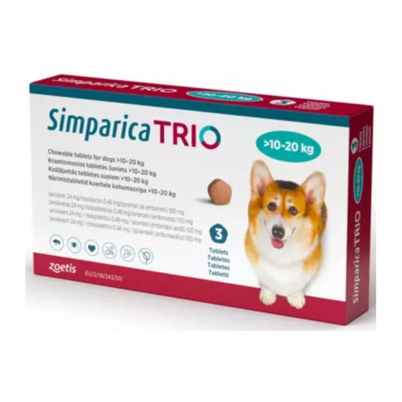 Simparica Trio Masticable Desparasitante Externo e Interno para Perro 10-20 kg, 3 Tabletas