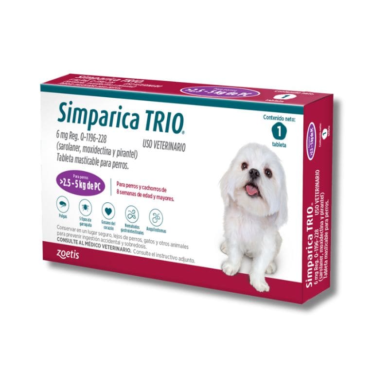 Simparica Trio Masticable Desparasitante Externo e Interno para Perro, 2.5 - 5 kg. 1 Tableta